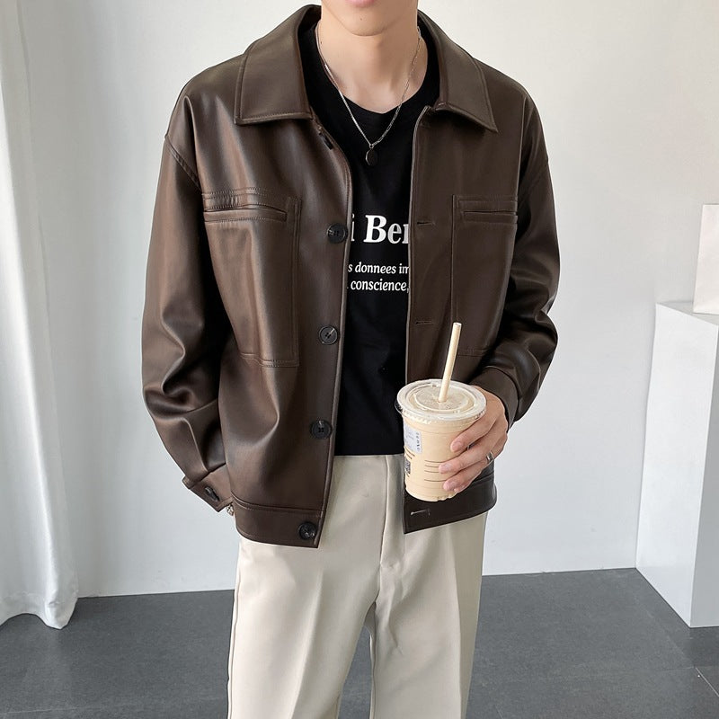 Autumn Retro Lapels Short Pu Leather Casual Jacket Men's Korean-style Niche Net Red Loose Leather Coat Ruffle Handsome Stylish